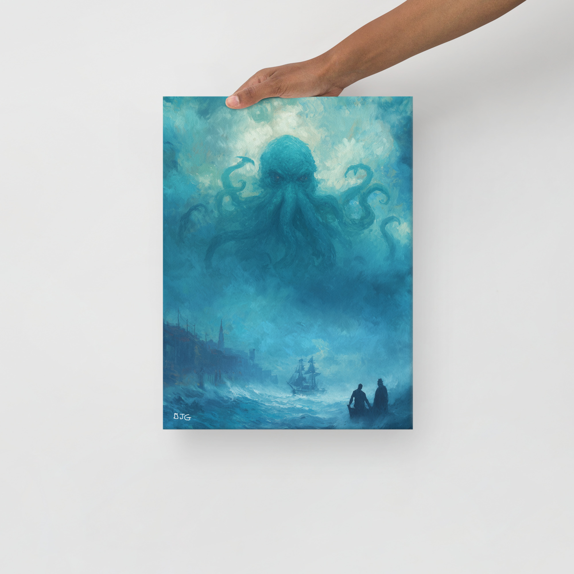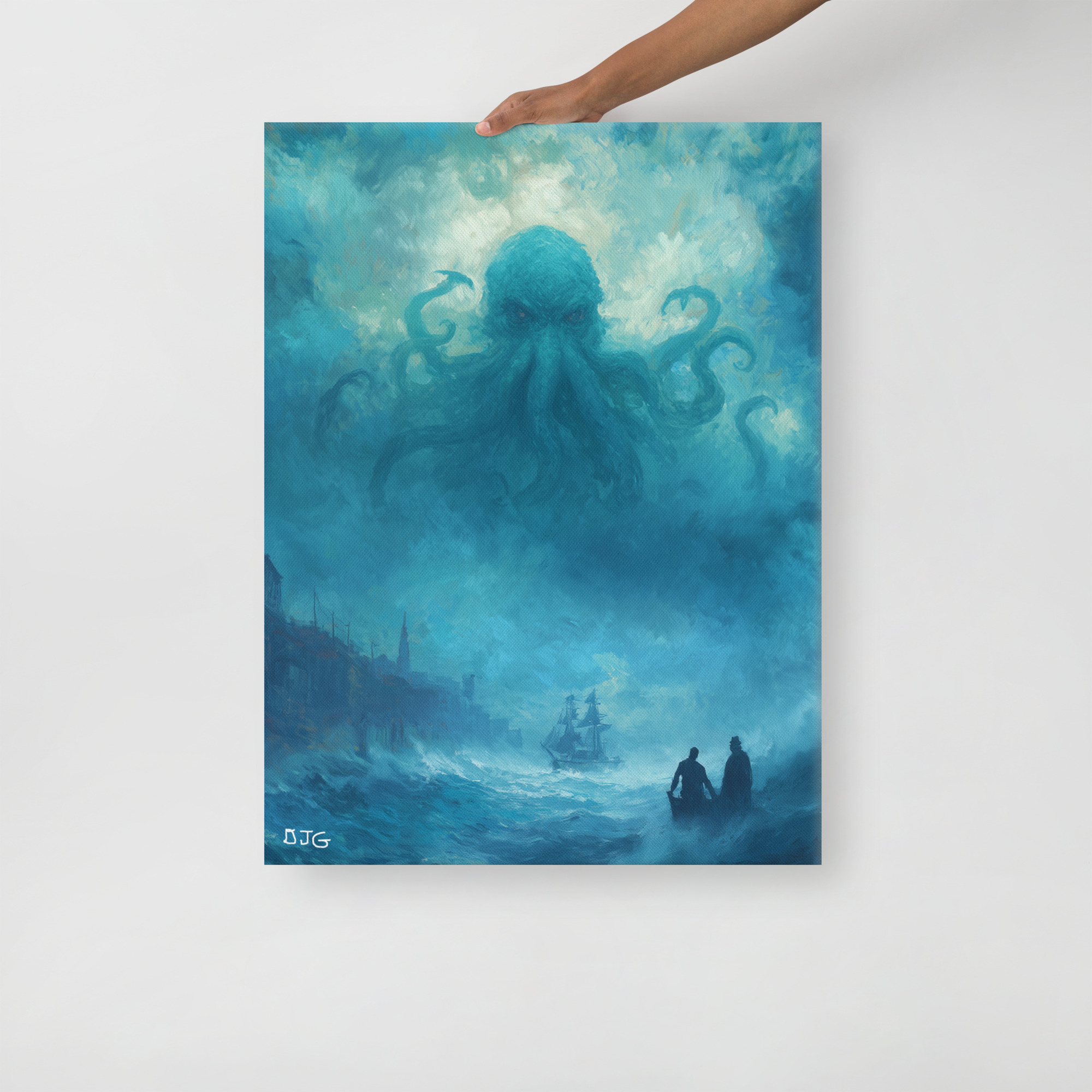 If you are wondering what the man is screaming at in Munch’s classic, you know have the answer. If you saw Cthulhu rising from the depths of the ocean, you would lose your mind too (literally and figuratively). Luckily this happened a long time ago, and it has been memorialized on this canvas, in the style of a beautiful oil painting.