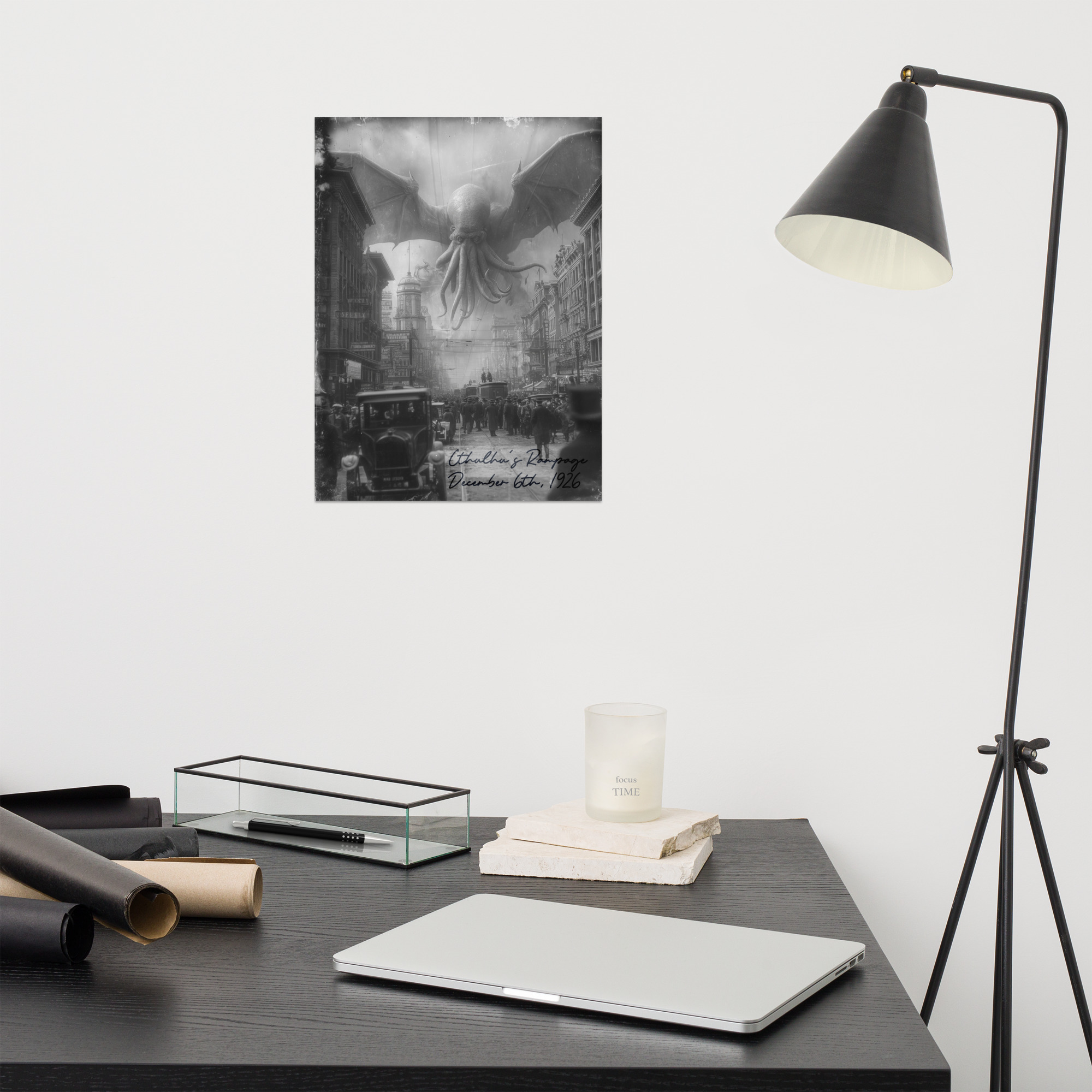 Several historic photographs depicting supernatural events were recently discovered by officers at Glennco. Some intrepid investigator snapped this shot off of Cthulhu’s last awakening, before his sanity snapped and he ran terrified through the streets. Now YOU can own a piece of history, but don’t stare at it too long, you too may succumb to the creeping madness.