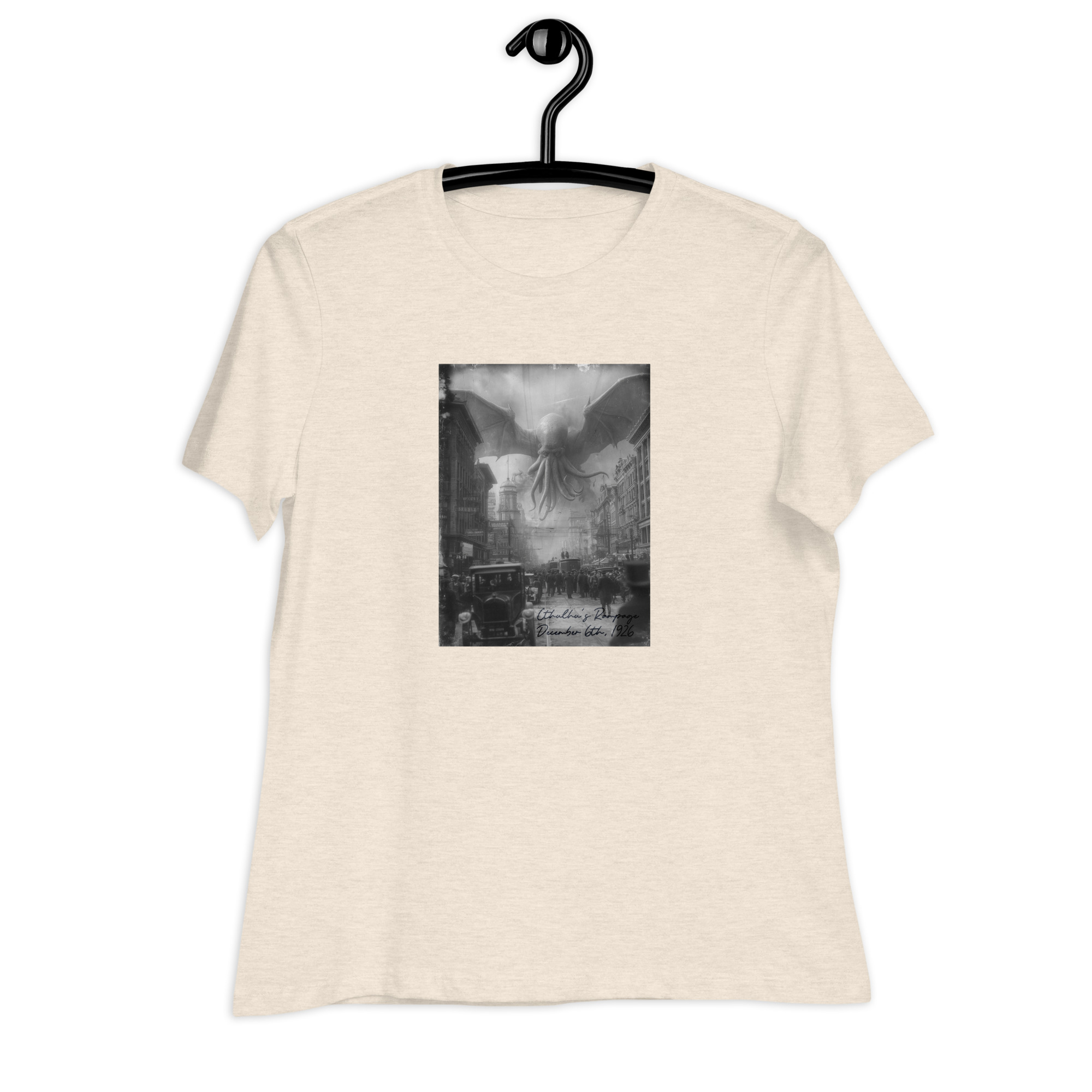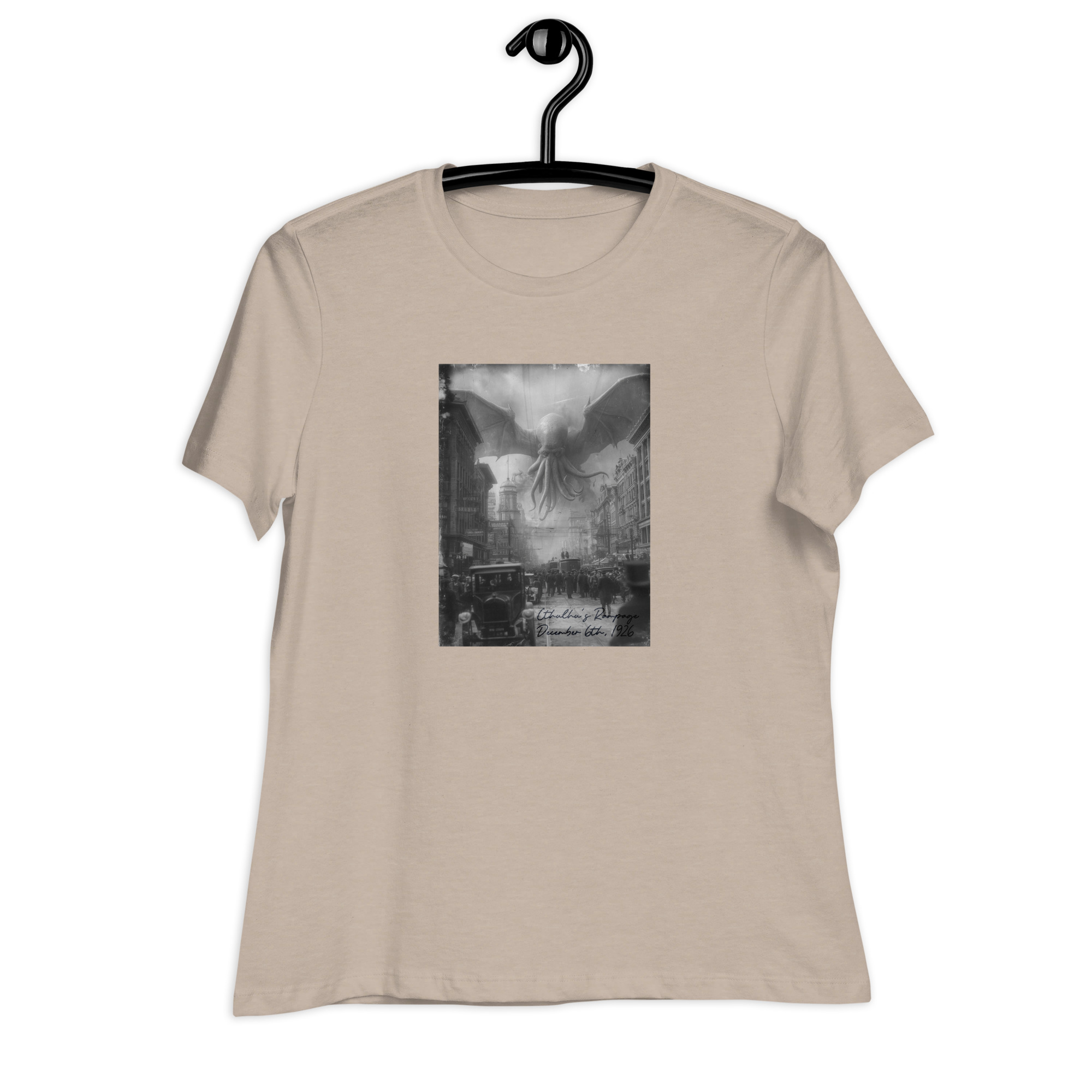 Several historic photographs depicting supernatural events were recently discovered by officers at Glennco. Some intrepid investigator snapped this shot off of Cthulhu’s last awakening, before his sanity snapped and he ran terrified through the streets. Wear this shirt as a testament to your mental toughness.