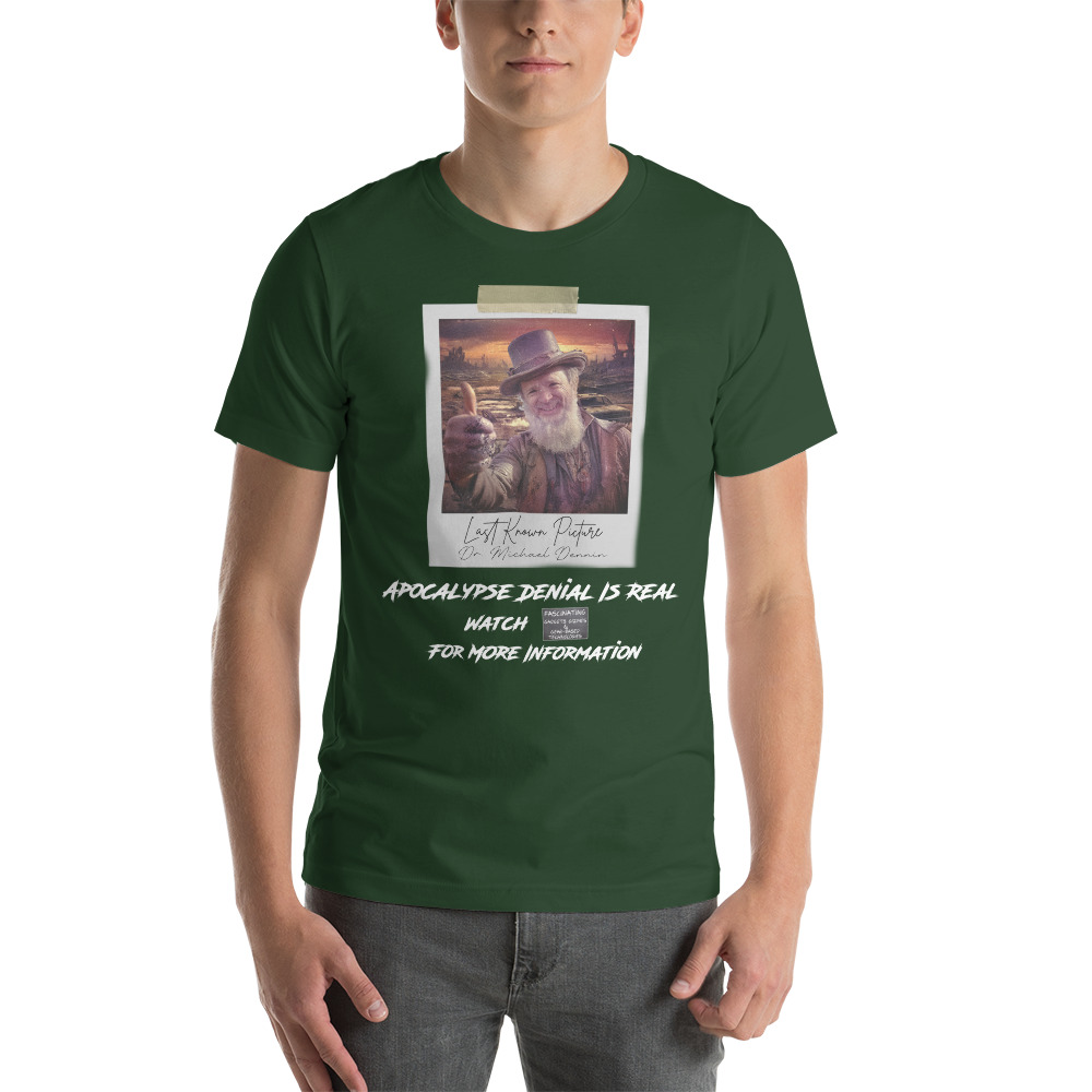 An apocalypse denier to the end Dr. Michael Dennin’s last photograph is immortalized here. Let’s help him change his future by buying this shirt.