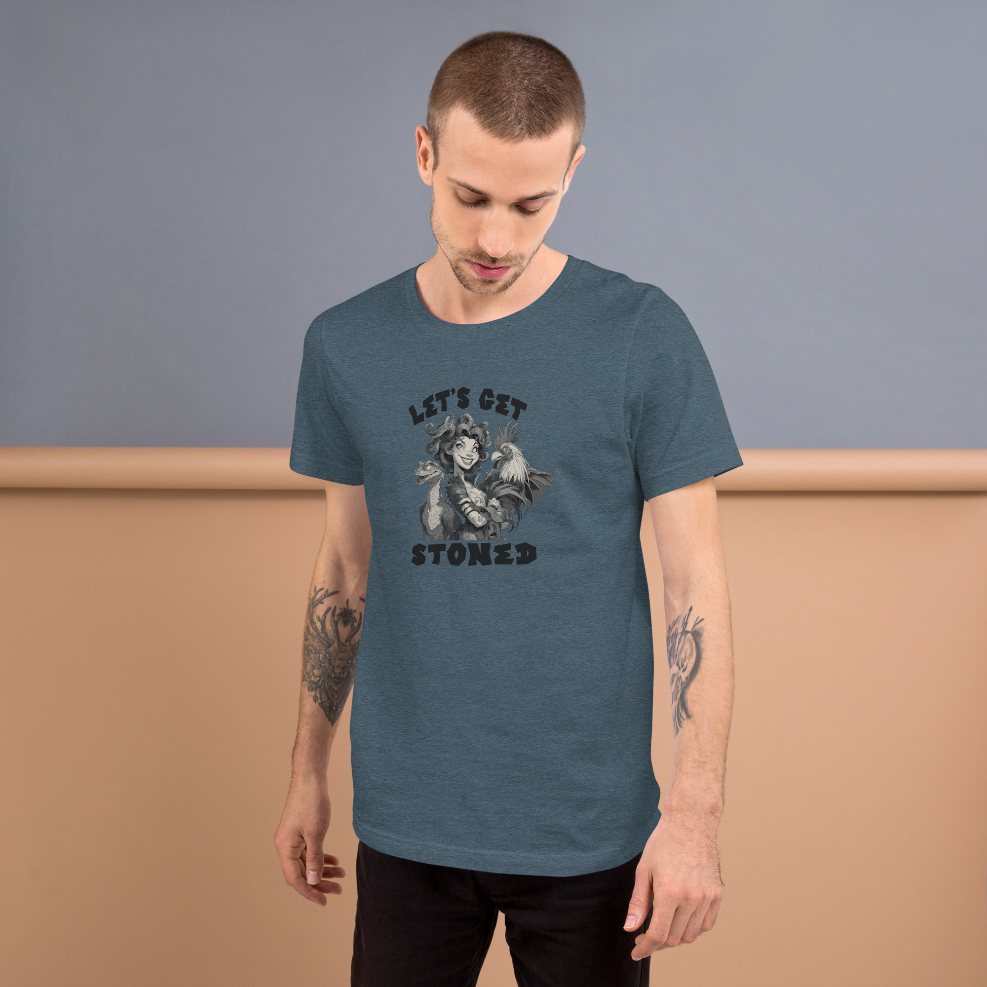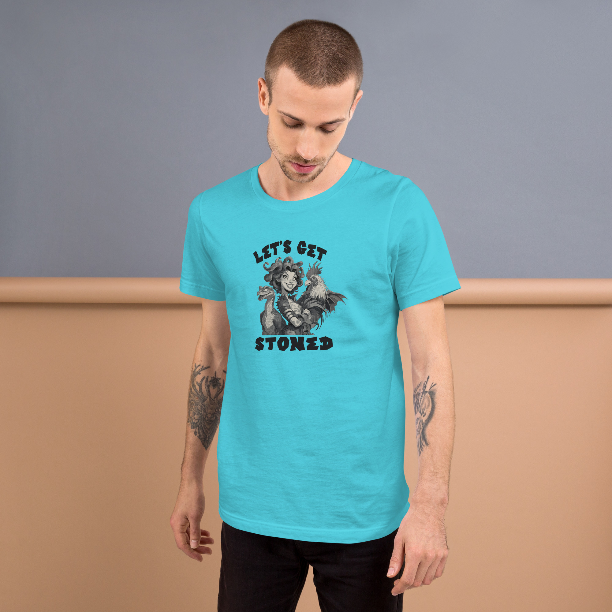 Not like that silly, by being petrified of course! Join Medusa, a basilisk, and a cockatrice for a stone cold party! While you may become solid rock, this shirt will remain comfortable and soft for years to come.